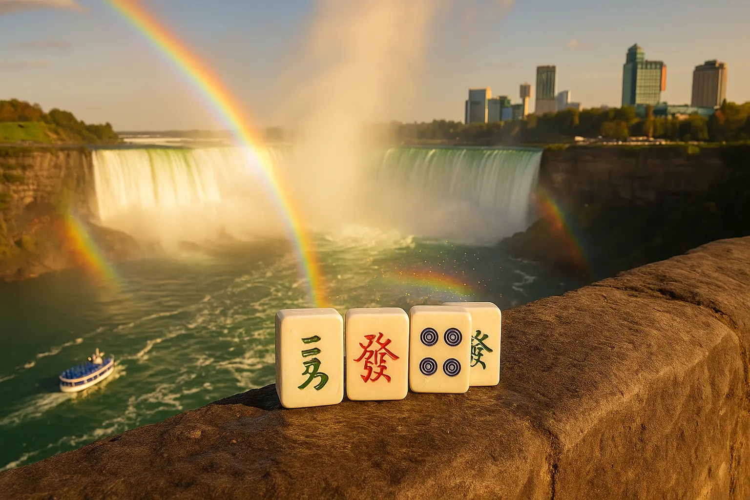 Experience the strategic thrill of mahjong set against the breathtaking backdrop of Niagara Falls, where local players gather to enjoy this timeless game of skill and chance.